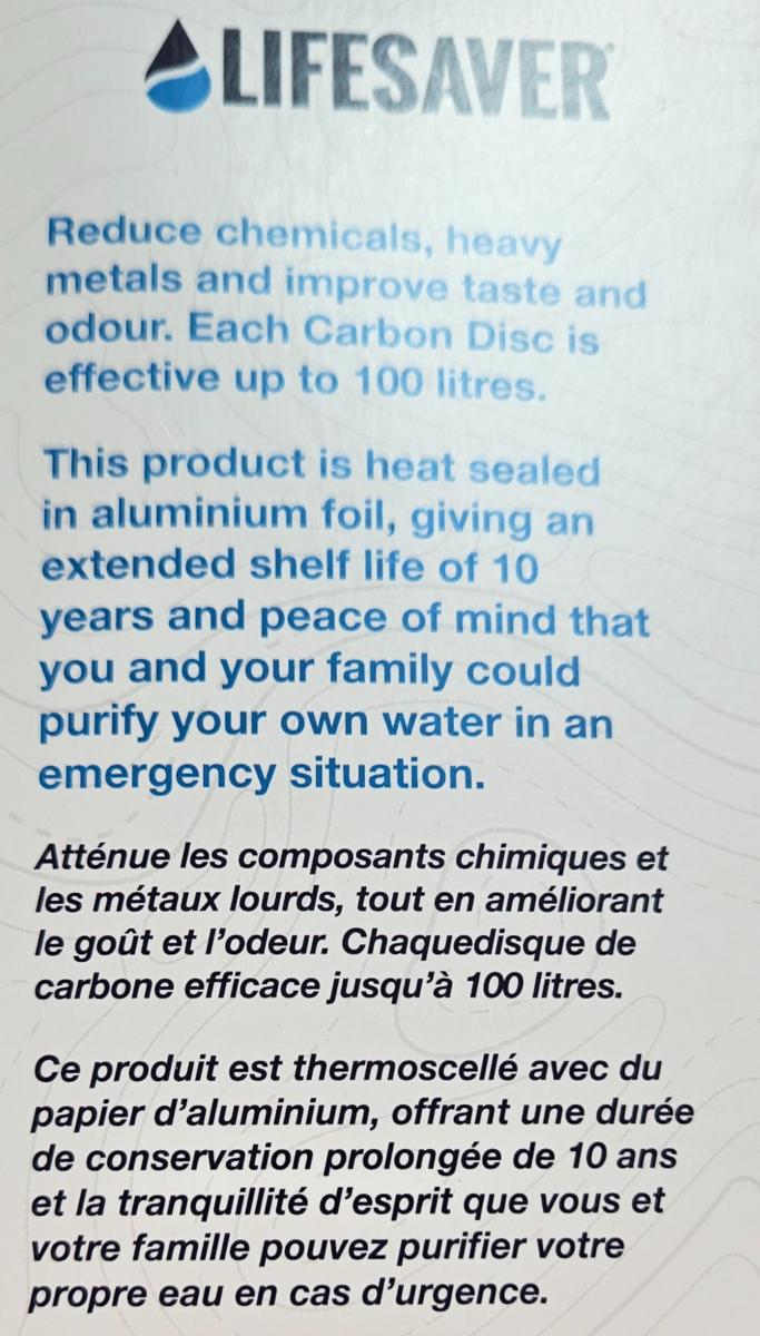 Ces disques de charbon actif remplaçables réduisent les produits chimiques et les métaux lourds tout en éliminant le mauvais goût et les odeurs, chacun étant efficace jusqu'à 100 litres. Nos disques de charbon actif standard  utilisés dans tous les produits LifeSaver ont été testés pour montrer une excellente et constante présence de métaux lourds et  de produits chimiques . réduction pour leur durée de vie indiquée sur une gamme de contaminants d'échantillon tels que le chlore, le plomb, le nickel et le cadmium. Améliorer le goût et l'odeur en cours de route.