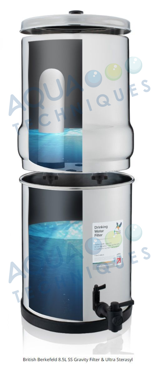 Purificateur d'eau en acier inoxydable à gravité British Berkefeld 12L avec 2 cartouches de filtration Ultra Stéaryl fonctionnant par gravité
