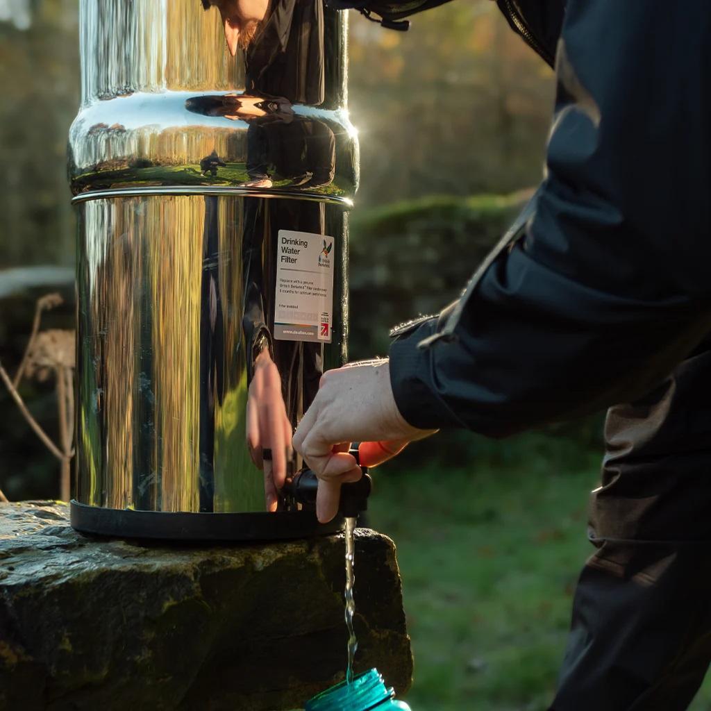 Purificateur d'eau en acier inoxydable à gravité British Berkefeld 12L avec 2 cartouches de filtration ultra  fluoride fonctionnant par gravité.